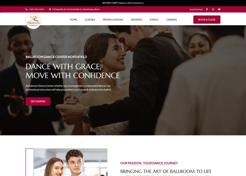 Ballroom Dance Ctr is a modern, client-focused website for a professional dance brand that helps individuals and enthusiasts.