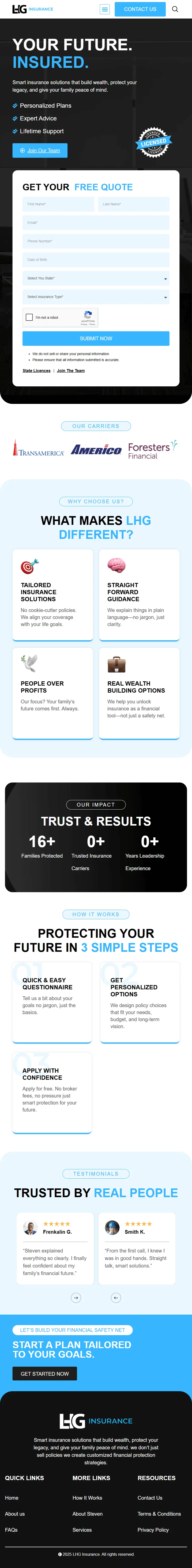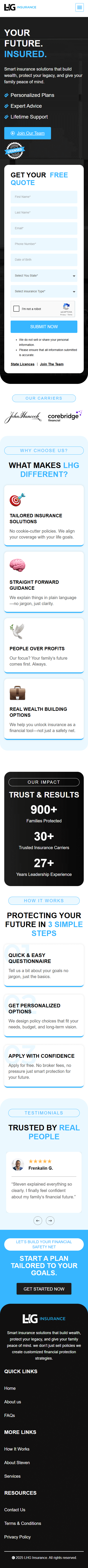 LHG Insurance is a modern, trust-driven insurance website designed to help individuals, families, and businesses secure reliable and comprehensive insurance coverage for long-term financial protection. Built with a clear focus on user experience and transparency, the platform simplifies the process of exploring insurance solutions, comparing policy options, and requesting personalized quotes. Visitors can easily navigate through essential coverage categories including life insurance, health insurance, auto insurance, home insurance, business insurance, and retirement planning solutions, each presented with clear explanations of benefits, eligibility requirements, and key features. The website’s professional design, informative content, and straightforward policy details reduce confusion often associated with insurance decisions, allowing users to make confident and informed choices. Strong calls to action, trust-building messaging, and a seamless quote request process work together to create a conversion-focused journey that prioritizes clarity, security, and dependability. From the compelling hero section emphasizing smart future planning to the detailed breakdown of coverage options, LHG Insurance provides a structured, reassuring experience that supports visitors at every step, helping them protect what matters most with confidence and peace of mind. LHG Insurance is a trusted online platform offering clear, reliable insurance solutions for individuals, families, and businesses. With easy-to-understand policy details, transparent coverage options, and a seamless quote process, the website helps users compare life, health, auto, home, and business insurance plans to secure long-term financial protection with confidence.