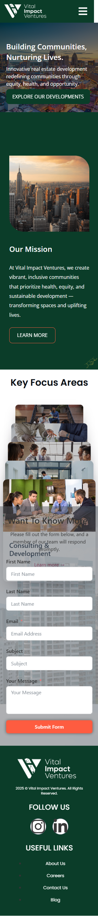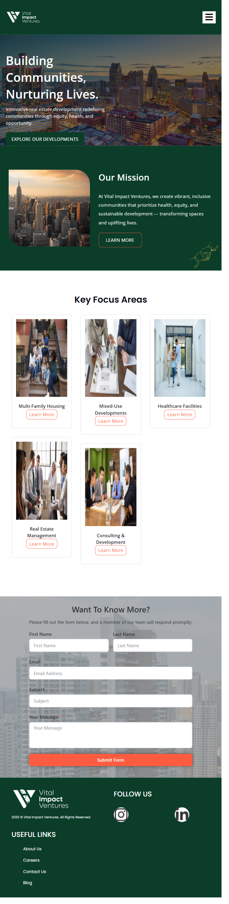 Vital Impact Ventures is a modern, client-focused platform designed to help entrepreneurs and businesses access strategic investment, growth, and advisory services with clarity, insight, and impact. The website’s mission is to present Vital Impact Ventures’ offerings in a professional, engaging, and easy-to-understand way so visitors quickly grasp available opportunities and feel confident pursuing strategic partnerships.